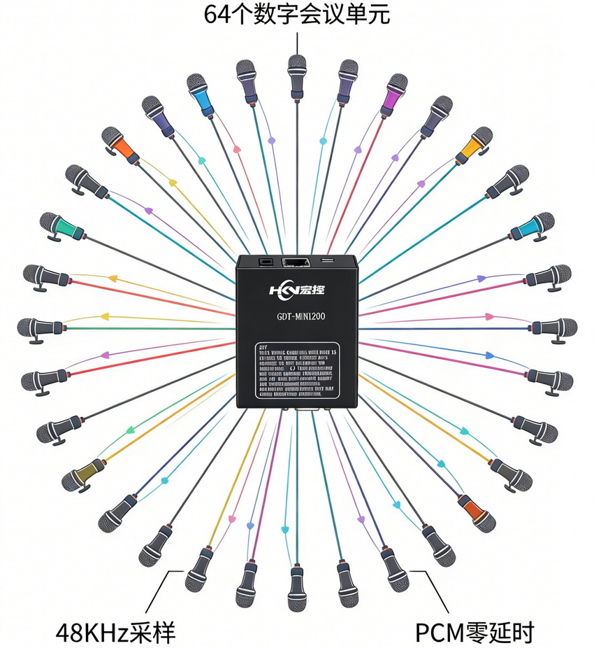 GDT-MINI200采用HD-Sound音频数字差分传输协议,通过一对差分线就能闭环发送64个音频通道,支持最多64个数字会议单元同时在线!