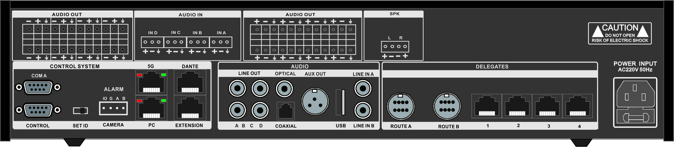 音频扩展:丰富接口(XLR, RCA, 光纤, 16路凤凰端子)轻松对接调音台、功放。可选配DANTE接口,融入专业音频环境。